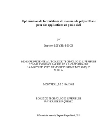 Meyer-Bisch, Baptiste (2018). Optimisation de formulations de mousses de polyuréthane pour des applications en génie civil. Mémoire de maîtrise électronique, Montréal, École de technologie supérieure.