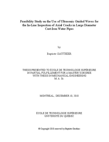 Gauthier, Baptiste (2018). Feasibility study on the use of ultrasonic guided waves for the in-line inspection of axial cracks in large diameter cast-iron water pipes. Mémoire de maîtrise électronique, Montréal, École de technologie supérieure.