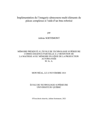 Soetemont, Adrien (2023). Implémentation de l’imagerie ultrasonore multi-éléments de pièces complexes à l’aide d’un bras robotisé. Mémoire de maîtrise électronique, Montréal, École de technologie supérieure.