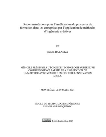 Balaska, Kenza (2024). Recommandations pour l’amélioration du processus de formation dans les entreprises par l’application de méthodes d’ingénierie créatives. Mémoire de maîtrise électronique, Montréal, École de technologie supérieure.