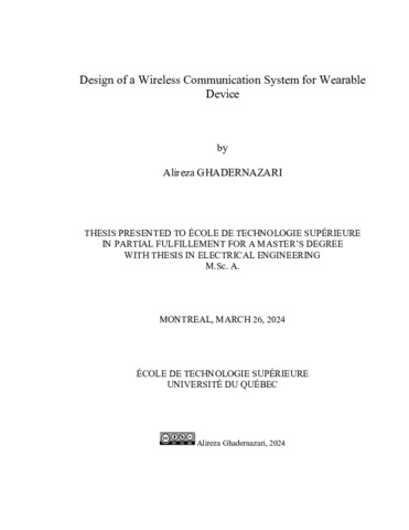 Ghadernazari, Alizera (2024). Design of a wireless communication system for wearable device. Mémoire de maîtrise électronique, Montréal, École de technologie supérieure.