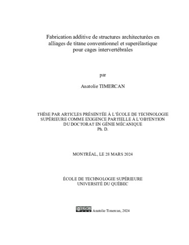 Timercan, Anatolie (2024). Fabrication additive de structures architecturées en alliages de titane conventionnel et superélastique pour cages intervertébrales. Thèse de doctorat électronique, Montréal, École de technologie supérieure.