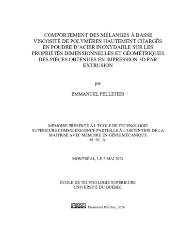 Pelletier, Emmanuel (2024). Comportement des mélanges à basse viscosité de polymères hautement chargés en poudre d’acier inoxydable sur les propriétés dimensionnelles et géométriques des pièces obtenues en impression 3D par extrusion. Mémoire de maîtrise électronique, Montréal, École de technologie supérieure.