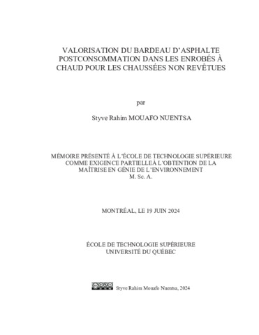 Mouafo Nuentsa, Styve Rahim (2024). Valorisation du bardeau d’asphalte postconsommation dans les enrobés à chaud pour les chaussées non revêtues. Mémoire de maîtrise électronique, Montréal, École de technologie supérieure.
