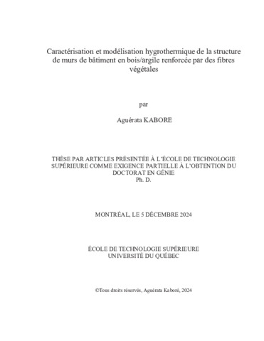 Kabore, Aguérata (2024). Caractérisation et modélisation hygrothermique de la structure de murs de bâtiment en bois/argile renforcée par des fibres végétales. Thèse de doctorat électronique, Montréal, École de technologie supérieure.