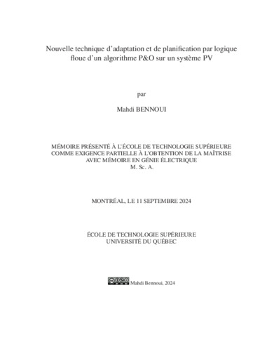 Bennoui, Mahdi (2024). Nouvelle technique d’adaptation et de planification par logique floue d’un algorithme P&O sur un système PV. Mémoire de maîtrise électronique, Montréal, École de technologie supérieure.