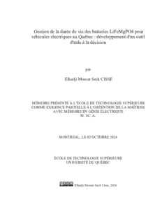 Cisse, Elhadji Momar Seck (2024). Gestion de la durée de vie des batteries LiFeMgPO4 pour véhicules électriques au Québec : développement d'un outil d'aide à la décision. Mémoire de maîtrise électronique, Montréal, École de technologie supérieure.