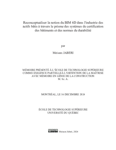 Jaberi, Meisam (2024). Reconceptualiser la notion du BIM 6D dans l'industrie des actifs bâtis à travers le prisme des systèmes de certification des bâtiments et des normes de durabilité. Mémoire de maîtrise électronique, Montréal, École de technologie supérieure.
