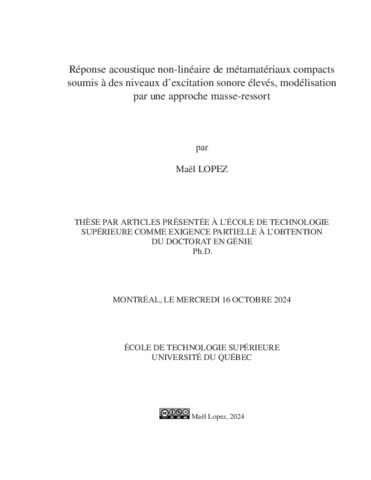 Lopez, Maël (2024). Réponse acoustique non-linéaire de métamatériaux compacts soumis à des niveaux d’excitation sonore élevés, modélisation par une approche masse-ressort. Thèse de doctorat électronique, Montréal, École de technologie supérieure.