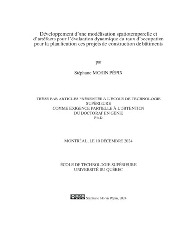Morin Pépin, Stéphane (2024). Développement d’une modélisation spatiotemporelle et d’artéfacts pour l’évaluation dynamique du taux d’occupation pour la planification des projets de construction de bâtiments. Thèse de doctorat électronique, Montréal, École de technologie supérieure.