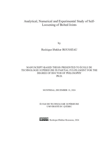 Rousseau, Rashique Iftekhar (2024). Analytical, numerical and experimental study of self-loosening of bolted joints. Thèse de doctorat électronique, Montréal, École de technologie supérieure.