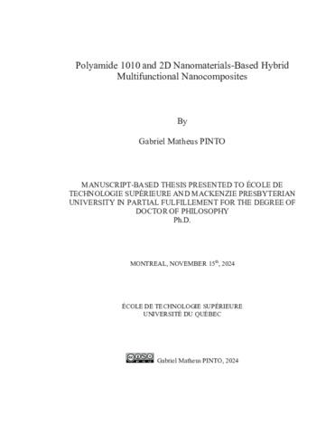 Pinto, Gabriel Matheus (2024). Polyamide 1010 and 2D nanomaterials-based hybrid multifunctional nanocomposites. Thèse de doctorat électronique, Montréal, École de technologie supérieure.