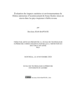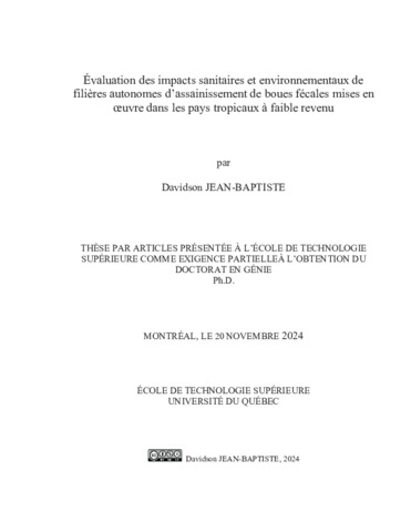 Jean-Baptiste, Davidson (2024). Évaluation des impacts sanitaires et environnementaux de filières autonomes d’assainissement de boues fécales mises en oeuvre dans les pays tropicaux à faible revenu. Thèse de doctorat électronique, Montréal, École de technologie supérieure.