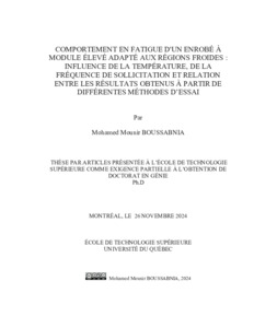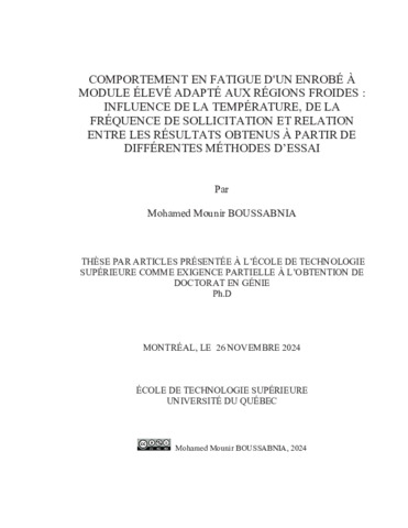 Boussabnia, Mohamed Mounir (2024). Comportement en fatigue d'un enrobé à module élevé adapté aux régions froides : influence de la température, de la fréquence de sollicitation et relation entre les résultats obtenus à partir de différentes méthodes d’essai. Thèse de doctorat électronique, Montréal, École de technologie supérieure.