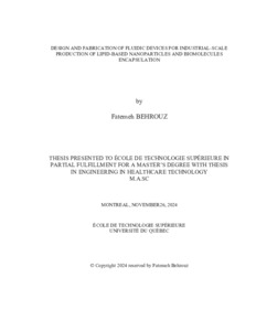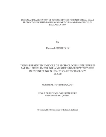 Behrouz, Fatemeh (2024). Design and fabrication of fluidic devices for industrial-scale production of lipid-based nanoparticles and biomolecules encapsulation. Mémoire de maîtrise électronique, Montréal, École de technologie supérieure.