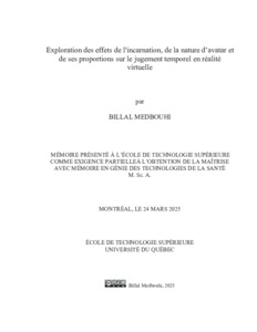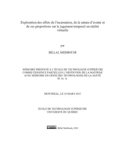 Medbouhi, Billal Adel (2025). Exploration des effets de l'incarnation, de la nature d’avatar et de ses proportions sur le jugement temporel en réalité virtuelle. Mémoire de maîtrise électronique, Montréal, École de technologie supérieure.