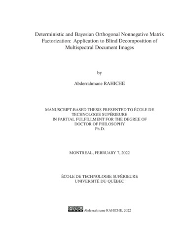 Rahiche, Abderrahmane (2022). Deterministic and Bayesian orthogonal nonnegative matrix factorization: application to blind decomposition of multispectral document images. Thèse de doctorat électronique, Montréal, École de technologie supérieure.