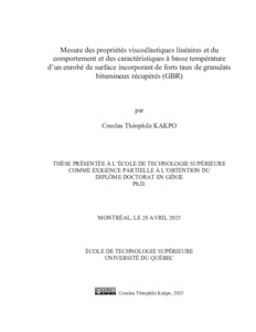 Kakpo, Comlan Théophile (2025). Mesure des propriétés viscoélastiques linéaires et du comportement et des caractéristiques à basse température d’un enrobé de surface incorporant de forts taux de granulats bitumineux récupérés (GBR). Thèse de doctorat électronique, Montréal, École de technologie supérieure.