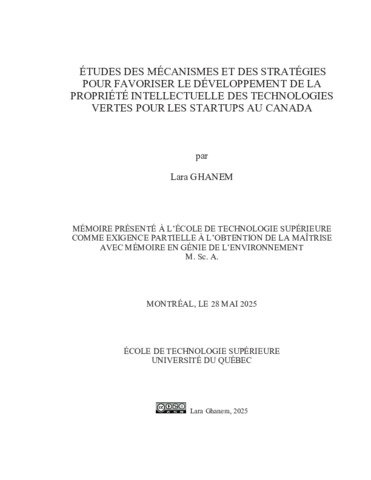 Ghanem, Lara (2025). Études des mécanismes et des stratégies pour favoriser le développement de la propriété intellectuelle des technologies vertes pour les startups au Canada. Mémoire de maîtrise électronique, Montréal, École de technologie supérieure.