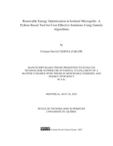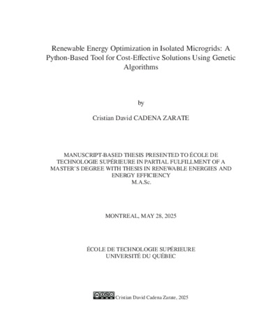 Cadena Zarate, Cristian David (2025). Renewable energy optimization in isolated microgrids: a Python-based tool for cost-effective solutions using genetic algorithms. Mémoire de maîtrise électronique, Montréal, École de technologie supérieure.