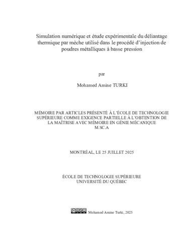 Turki, Mohamed Amine (2025). Simulation numérique et étude expérimentale du déliantage thermique par mèche utilisé dans le procédé d’injection de poudres métalliques à basse pression. Mémoire de maîtrise électronique, Montréal, École de technologie supérieure.