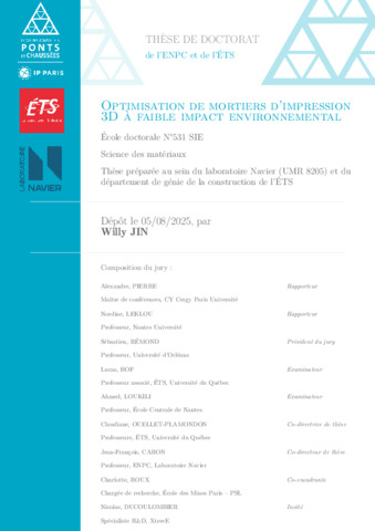 Jin, Willy (2025). Optimisation de mortiers d’impression 3D à faible impact environnemental. Thèse de doctorat électronique, Montréal, École de technologie supérieure.