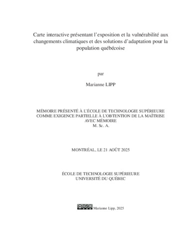 Lipp, Marianne (2025). Carte interactive présentant l’exposition et la vulnérabilité aux changements climatiques et des solutions d’adaptation pour la population québécoise. Mémoire de maîtrise électronique, Montréal, École de technologie supérieure.