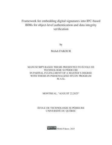 Fakour, Mehdi (2025). Framework for embedding digital signatures into IFC-based BIMs for object-level authentication and data integrity verification. Mémoire de maîtrise électronique, Montréal, École de technologie supérieure.