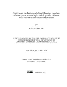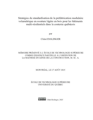 Esslinger, Chloé (2025). Stratégies de standardisation de la préfabrication modulaire volumétrique en ossature légère en bois pour les bâtiments multi-résidentiels dans le contexte québécois. Mémoire de maîtrise électronique, Montréal, École de technologie supérieure.