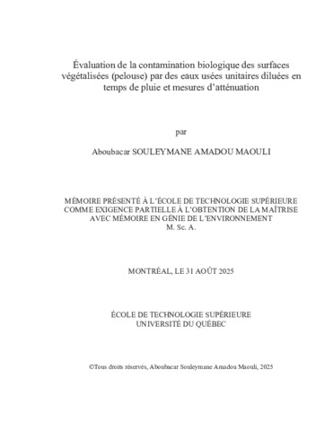 Souleymane Amadou Maouli, Aboubacar (2025). Évaluation de la contamination biologique des surfaces végétalisées (pelouse) par des eaux usées unitaires diluées en temps de pluie et mesures d’atténuation. Mémoire de maîtrise électronique, Montréal, École de technologie supérieure.