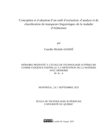 Gagné, Camille Michèle (2025). Conception et évaluation d’un outil d’extraction, d’analyse et de classification de marqueurs linguistiques de la maladie d’Alzheimer. Mémoire de maîtrise électronique, Montréal, École de technologie supérieure.