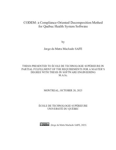 Safe, Jorge da Matta Machado (2025). CODEM: a compliance-oriented decomposition method for Québec health system software. Mémoire de maîtrise électronique, Montréal, École de technologie supérieure.