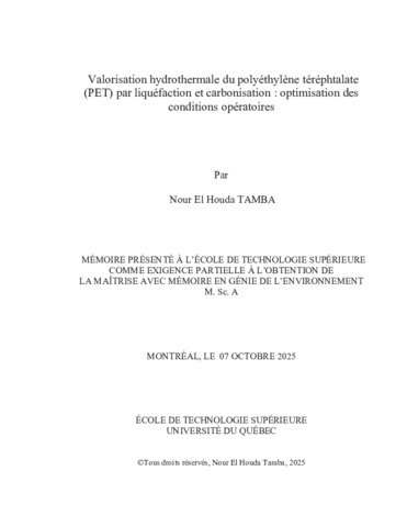 Tamba, Nour El Houda (2025). Valorisation hydrothermale du polyéthylène téréphtalate (PET) par liquéfaction et carbonisation : optimisation des conditions opératoires. Mémoire de maîtrise électronique, Montréal, École de technologie supérieure.