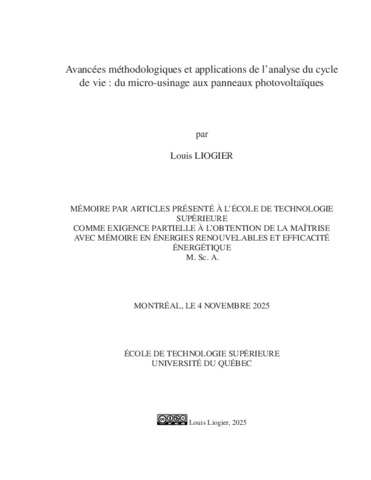 Liogier, Louis (2025). Avancées méthodologiques et applications de l’analyse du cycle de vie : du micro-usinage aux panneaux photovoltaïques. Mémoire de maîtrise électronique, Montréal, École de technologie supérieure.