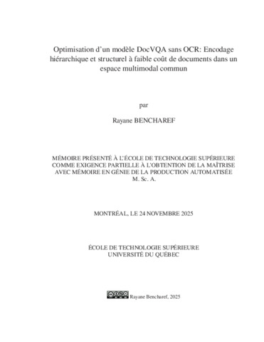 Bencharef, Rayane (2025). Optimisation d’un modèle DocVQA sans OCR: Encodage hiérarchique et structurel à faible coût de documents dans un espace multimodal commun. Mémoire de maîtrise électronique, Montréal, École de technologie supérieure.