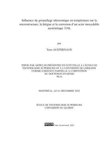 Austernaud, Yann (2025). Influence du grenaillage ultrasonique en température sur la microstructure, la fatigue et la corrosion d’un acier inoxydable austénitique 316L. Thèse de doctorat électronique, Montréal, École de technologie supérieure.