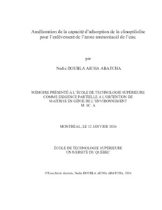 Doubla Aicha Abatcha, Nadia (2026). Amélioration de la capacité d’adsorption de la clinoptilolite pour l’enlèvement de l’azote ammoniacal de l’eau. Mémoire de maîtrise électronique, Montréal, École de technologie supérieure.
