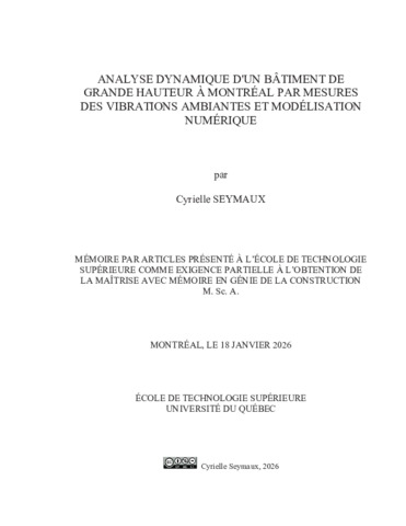 Seymaux, Cyrielle (2026). Analyse dynamique d'un bâtiment de grande hauteur à Montréal par mesures des vibrations ambiantes et modélisation numérique. Mémoire de maîtrise électronique, Montréal, École de technologie supérieure.
